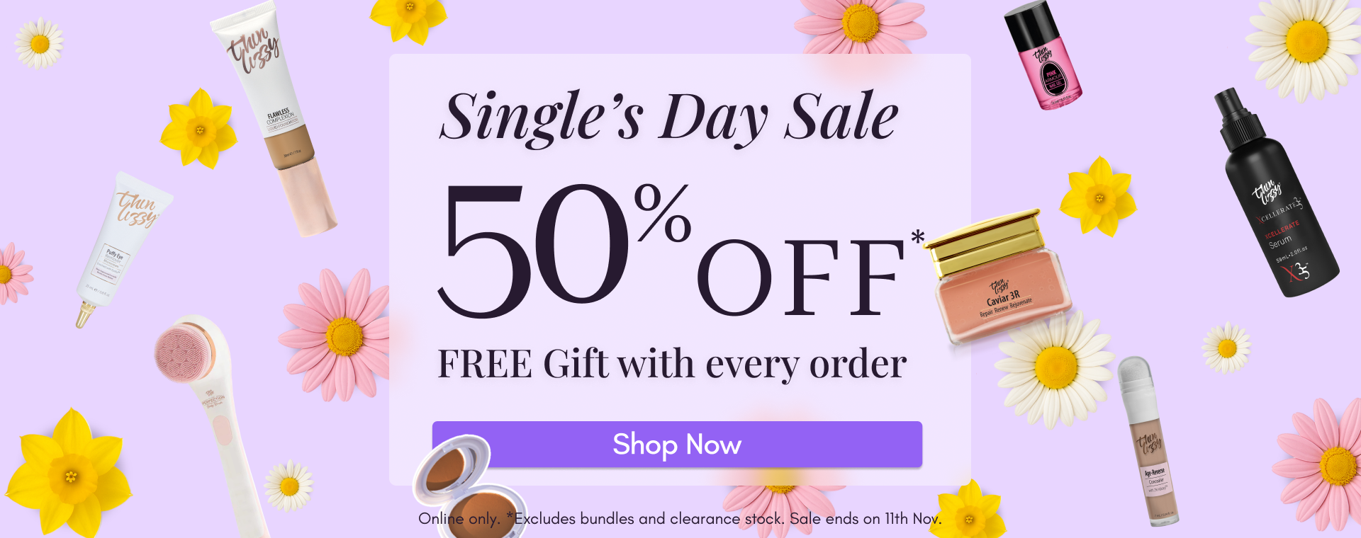 *50% Off selected single items only, excludes bundles and discounted products. All discount codes will be disabled during the sale. The promotion runs on 11 Nov 2025. Free gift on every order.